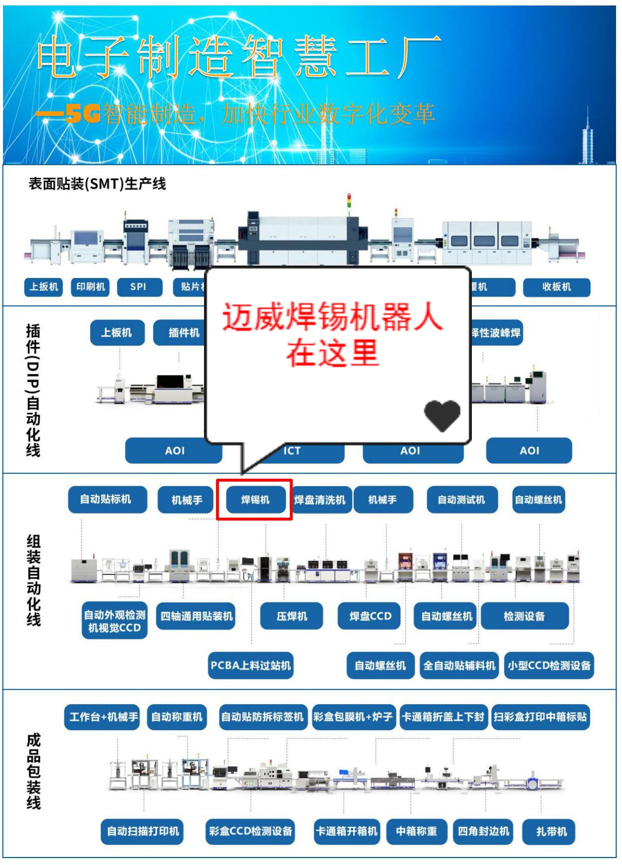 邁威是國(guó)內(nèi)領(lǐng)先的焊錫解決方案專業(yè)提供商,專注于焊錫自動(dòng)化領(lǐng)域,堅(jiān)持務(wù)實(shí)的經(jīng)營(yíng)理念,持續(xù)創(chuàng)新,為廣大電子產(chǎn)品制造商提供有競(jìng)爭(zhēng)力的焊錫設(shè)備。并致力于焊錫技術(shù)的研究與推廣,不斷提升客戶產(chǎn)品競(jìng)爭(zhēng)力。公司自推出首臺(tái)電腦版焊錫機(jī)以來(lái),不斷加大在焊錫領(lǐng)域的研發(fā)力度,陸續(xù)推出了多軸全自動(dòng)焊錫機(jī)、視覺(jué)焊錫機(jī)、伺服焊錫機(jī)、全自動(dòng)焊線機(jī)、智能激光焊錫機(jī)等產(chǎn)品。